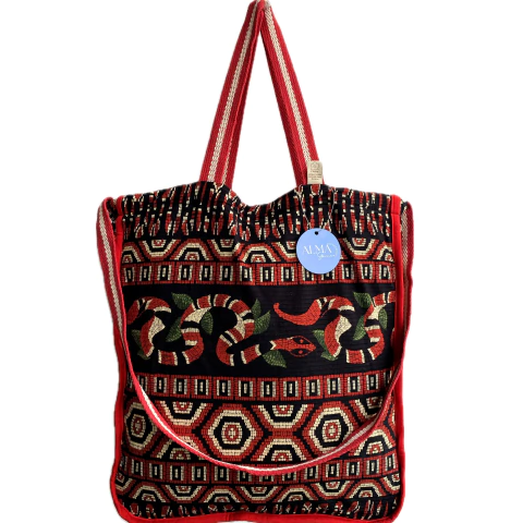 Maxi Ecobag com tecido em malha e com forro liso em viscolinho/linho, bolsinho interno, três alças reforçadas e presilha lateral.