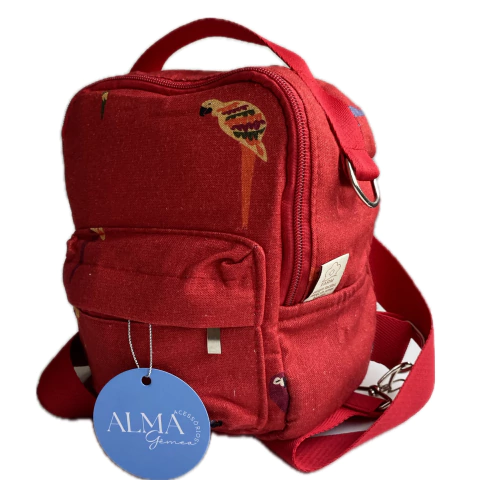 Mini mochila com calça regulável, forro liso com bolsinho telado no fundo e bolsinho externo.